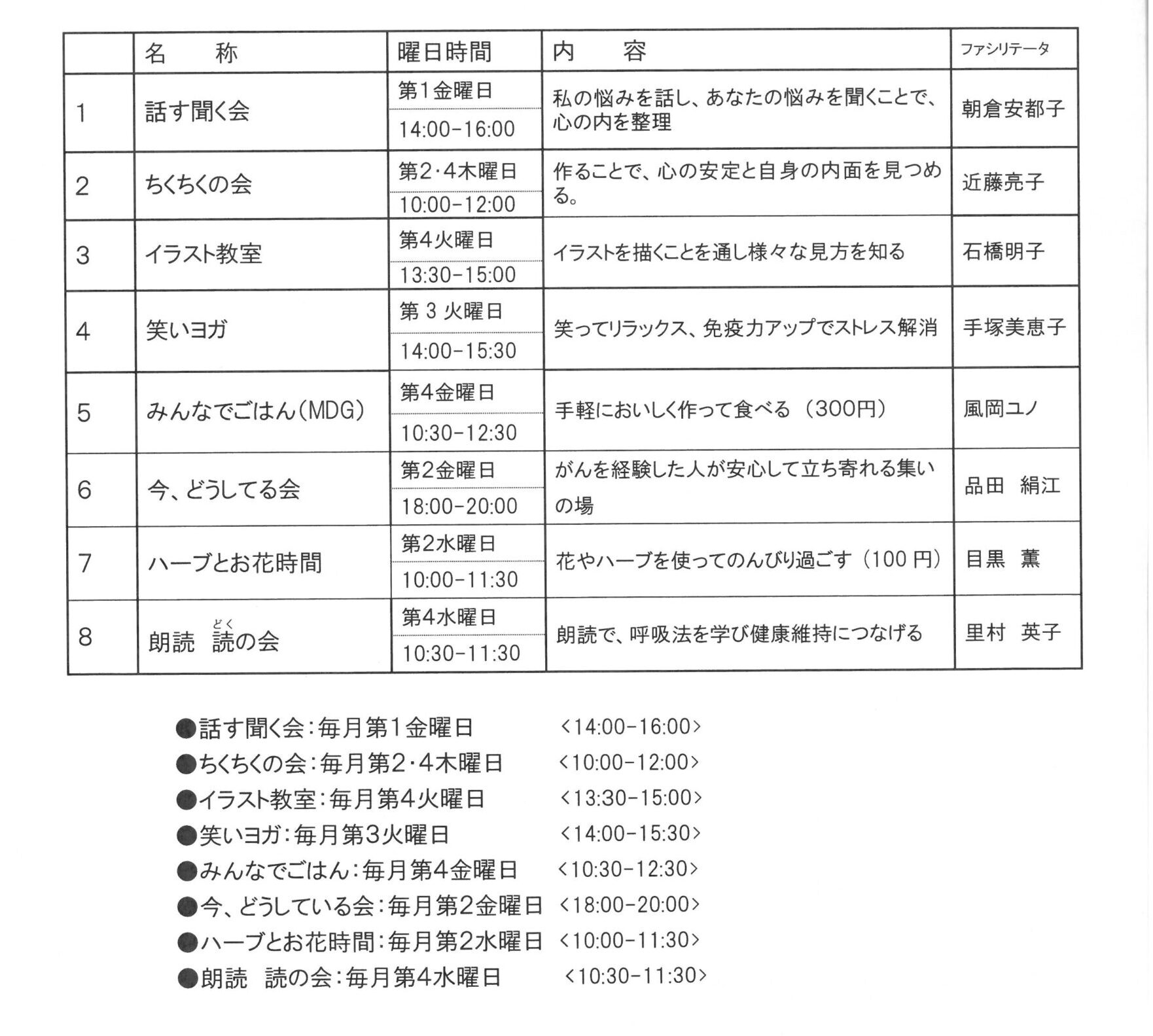 ※「みんなでごはん」と「ハーブとお花時間」は材料費負担あり。