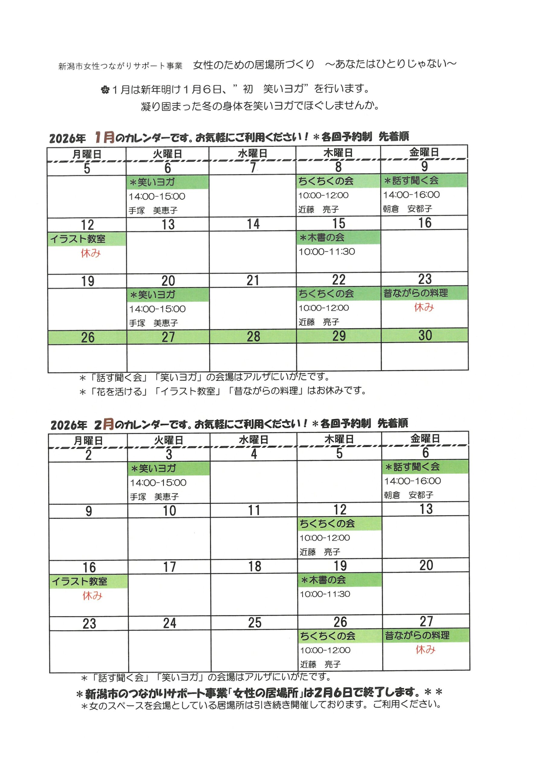 居場所カレンダー X Facebook LINE 2025.05.192026.01.05参加する場合は、事前に下記電話番号までご予約をお願いします。TEL:025-231-3012※「話す・聞く会」、「木書の会」、「笑いヨガ」の会場はアルザにいがたです。※「花を活ける」と「昔ながらの料理」は材料費負担あり。