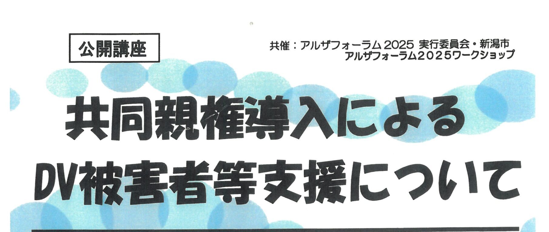 共同親権導入によるDV被害者等支援について X Facebook LINE 2025.09.222025.10.17アルザフォーラム2025 ワークショップ公開講座参加費無料申込〆切 10月31日(金)2024年5月に離婚後も共同親権を選択できるように法律が改正され、2026年5月までに施行されます。共同親権の導入について一緒に学習してみませんか。